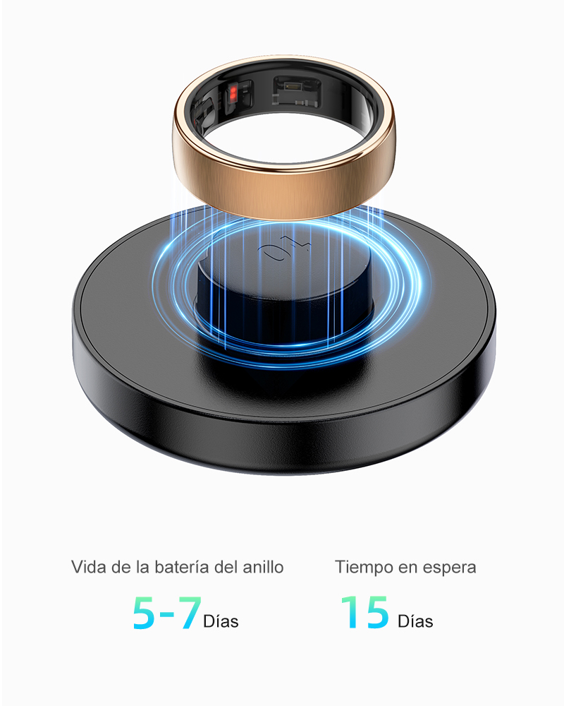 Coloque el anillo sobre la base de carga inalámbrica y conecte la fuente de alimentación para cargarlo.